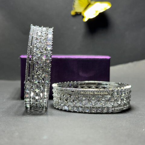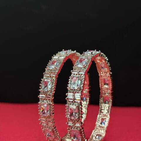 Radiant Medallion Statement Bangles – Dual-Tone Pastel & White Zirconia Kadas in Polished Silver Finish (Set of 2)