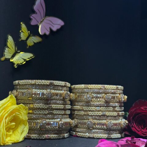 Exquisite Gold-Toned Bridal Chura Set – Handcrafted Designer Bangles with Kundan-Style Stones, Baguette Crystals, and Pearl Accents