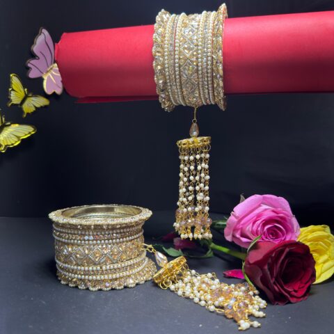 Exquisite Handcrafted Bridal Chura Set – Antique Gold Finish with Pearl Accents, Kundan-Style Stones & Floral Beadwork