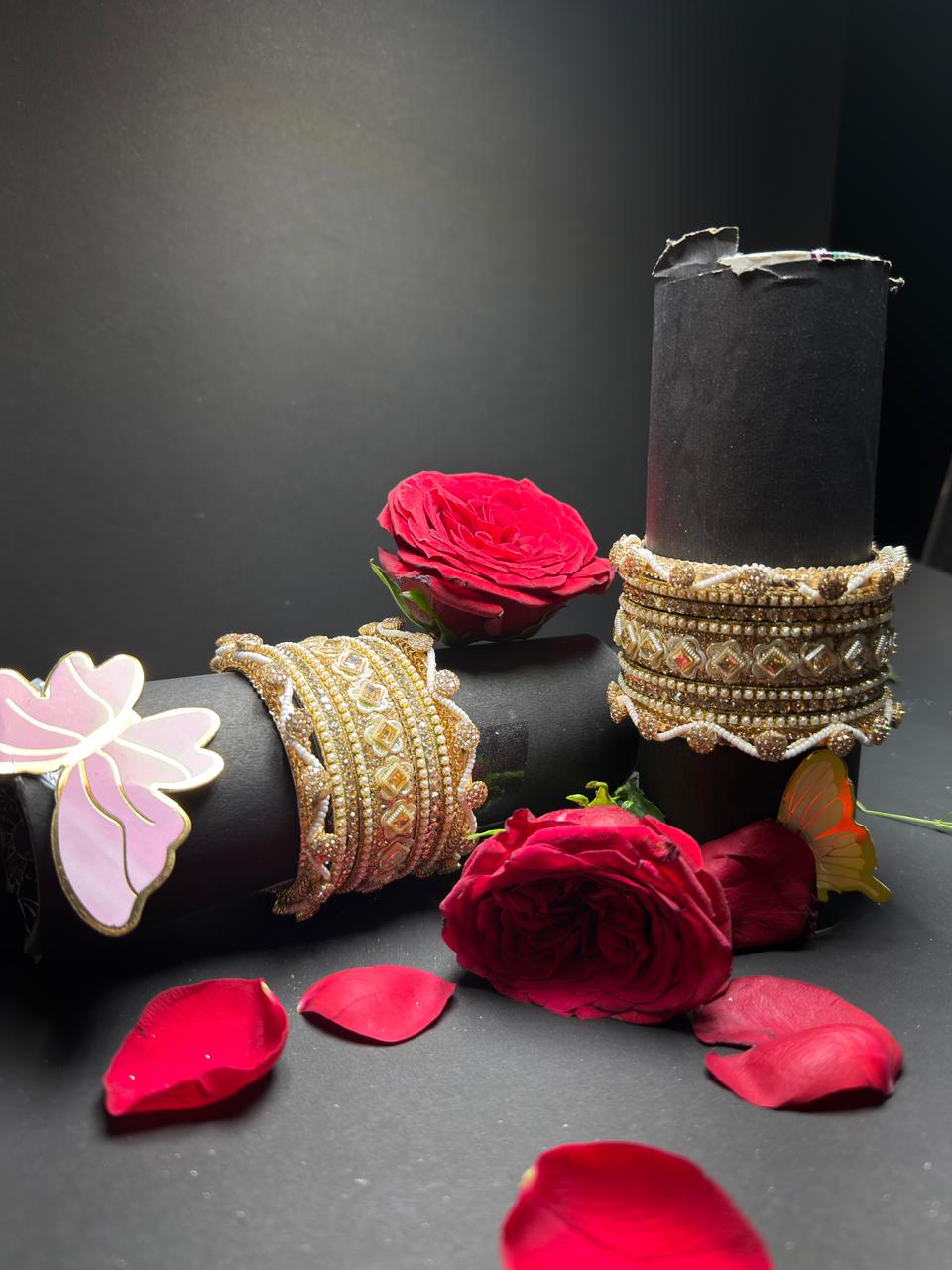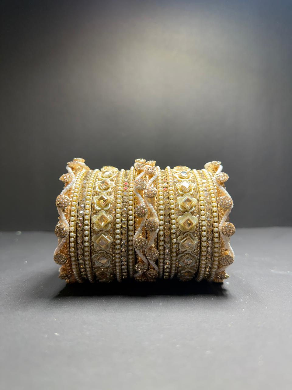 Intricate Detailing: Features a mix of broad “Kada” style bangles with floral Kundan settings and sleek pearl-accented dividers.