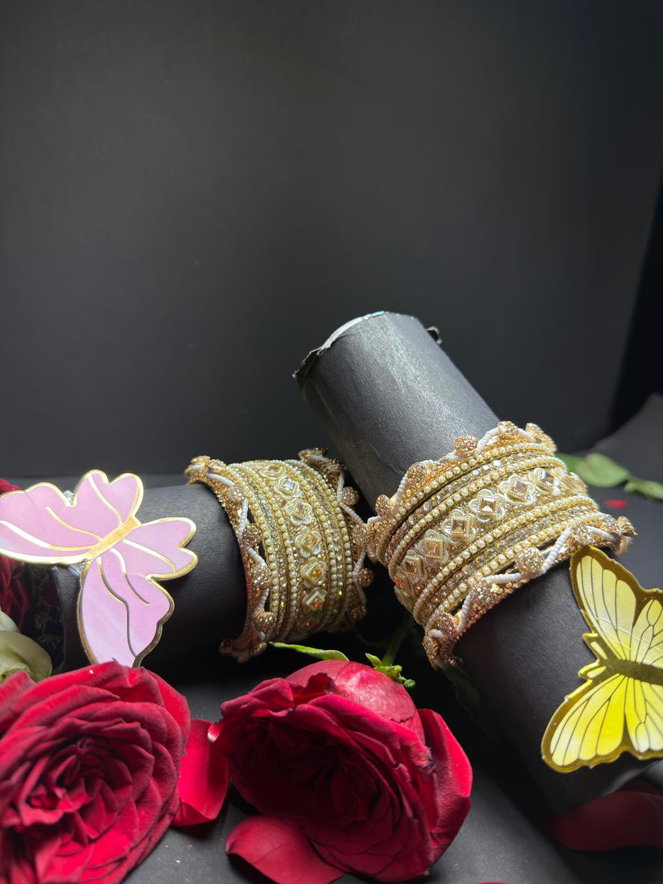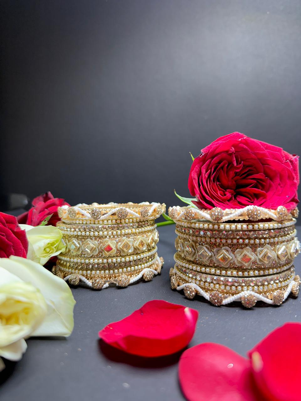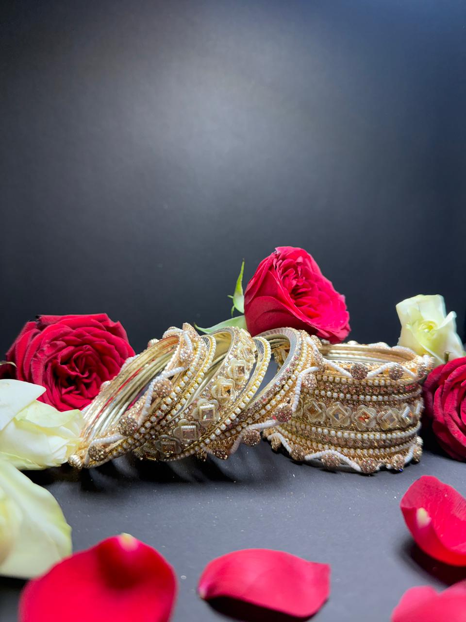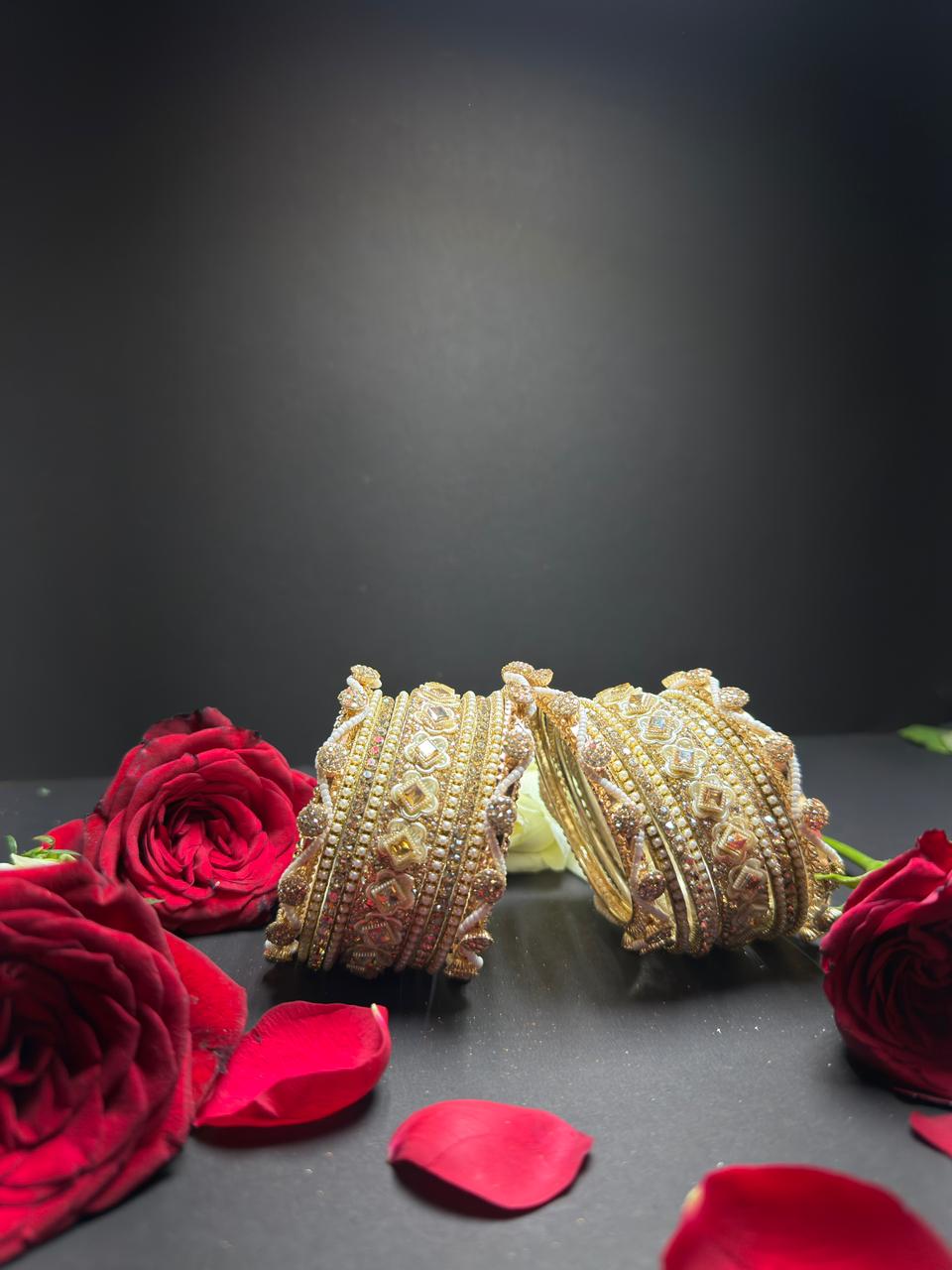Elevate your ethnic ensemble with this breathtaking gold-toned bangle set. Featuring a rich blend of shimmering Kundan stones, delicate white pearls, and intricate floral motifs, this set is designed to add a royal touch to weddings, festivals, and special occasions. Lightweight yet high-impact, it is the perfect statement piece for the modern bride.