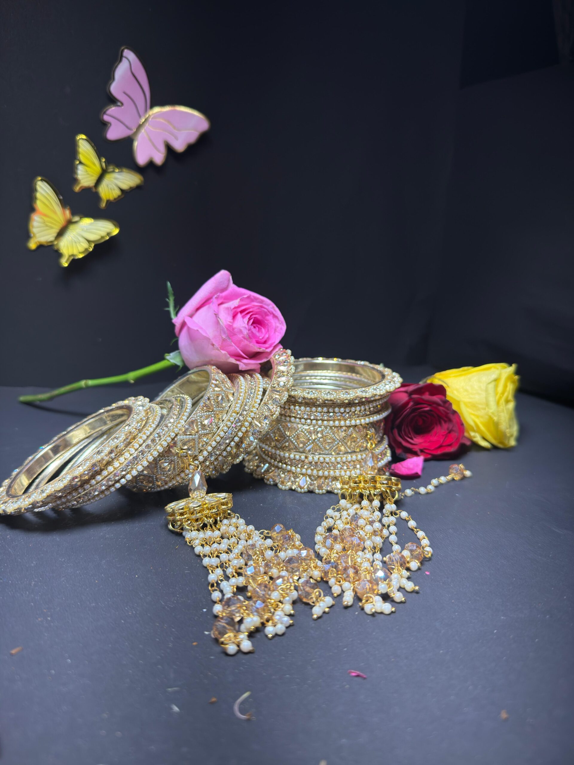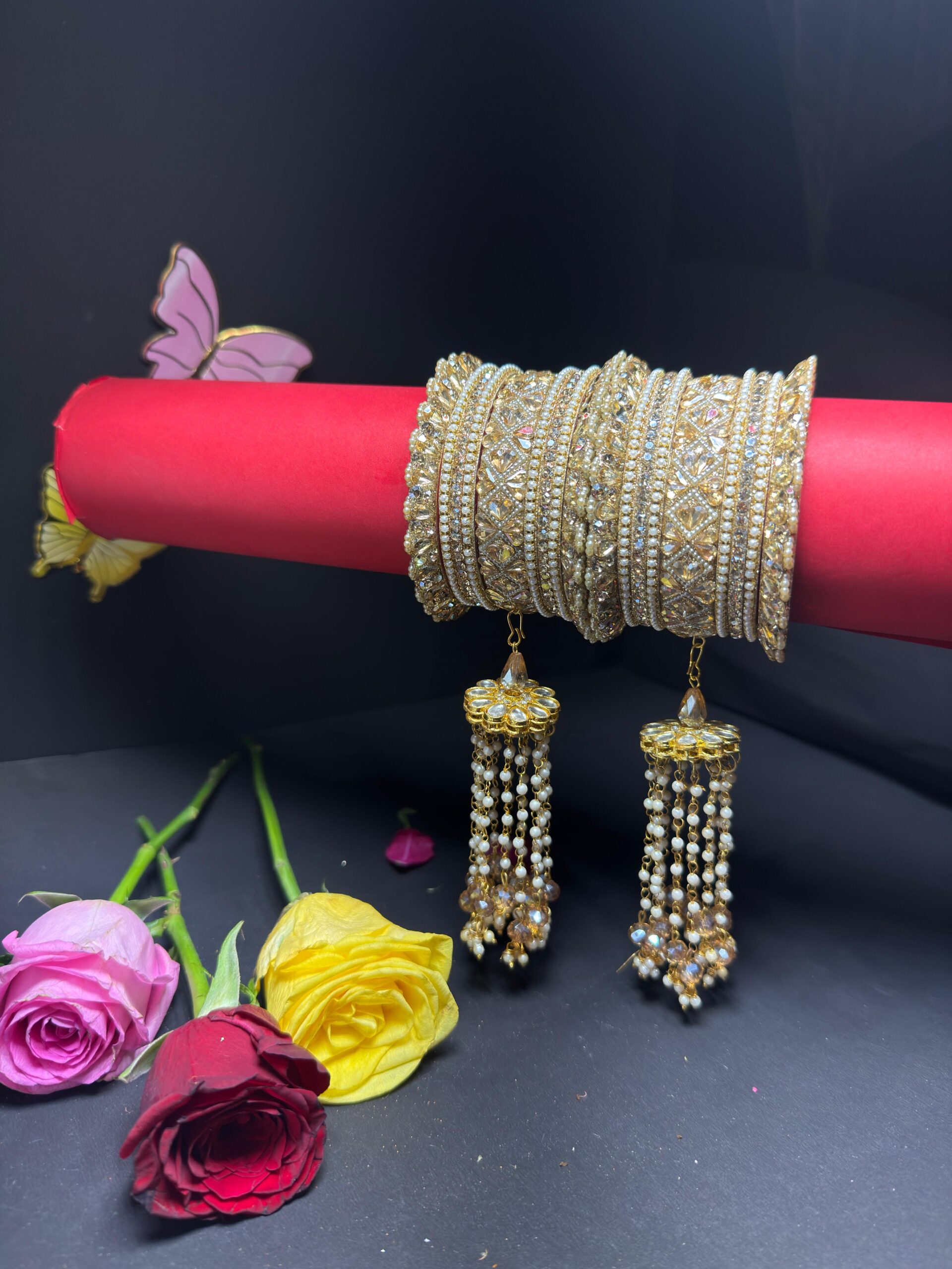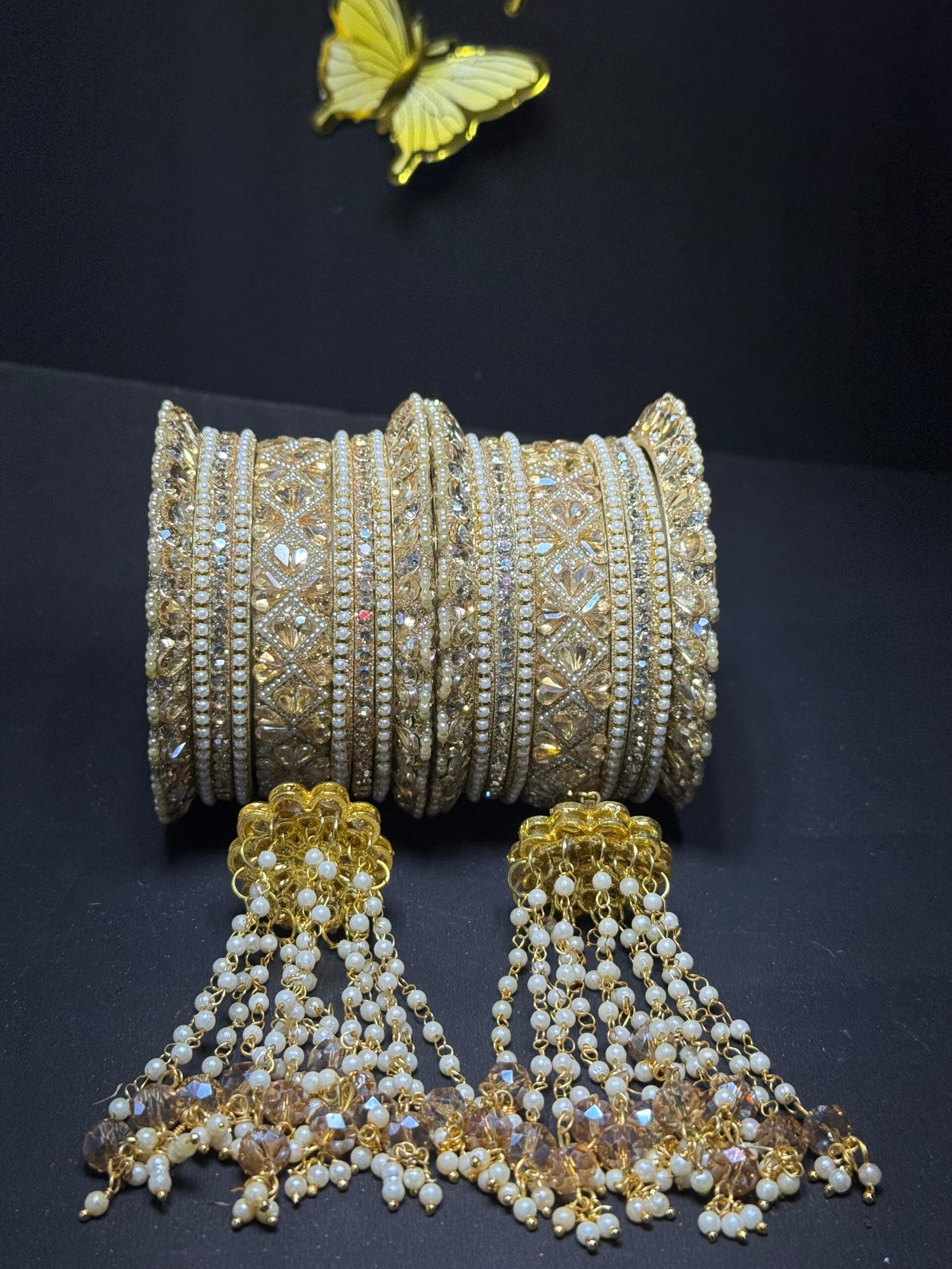 Elevate your ethnic ensemble with this stunning handcrafted bangle set. Featuring a rich gold-toned base, this set is meticulously embellished with sparkling champagne stones, intricate Kundan patterns, and delicate seed pearls. The highlight is the pair of ornate latkan (tassel) attachments, featuring cascading pearl chains and faceted crystal drops that add a graceful movement to your look. Perfect for brides, bridesmaids, or festive celebrations.